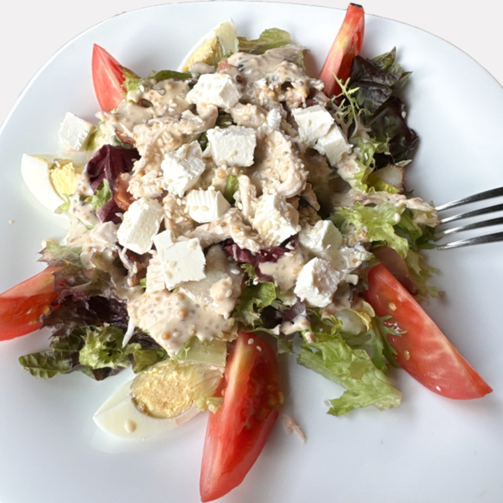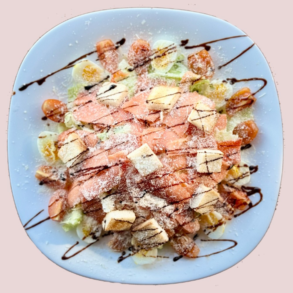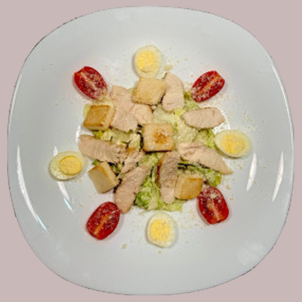 Салат Цезар з куркою – це класичний салат, що поєднує хрусткий салат айсберг, ніжне куряче філе та ароматний пармезан. Важливими складовими є свіжі помідори коктейльні та перепелині яйця, що додають кремової текстури. Тостовий хліб підсмажується до золотистої скоринки, а все це заправляється смачним соусом Цезар. Подається цей салат з легким посипанням кам’яної солі для балансу смаку. Це ідеальна страва для обіду чи вечері.